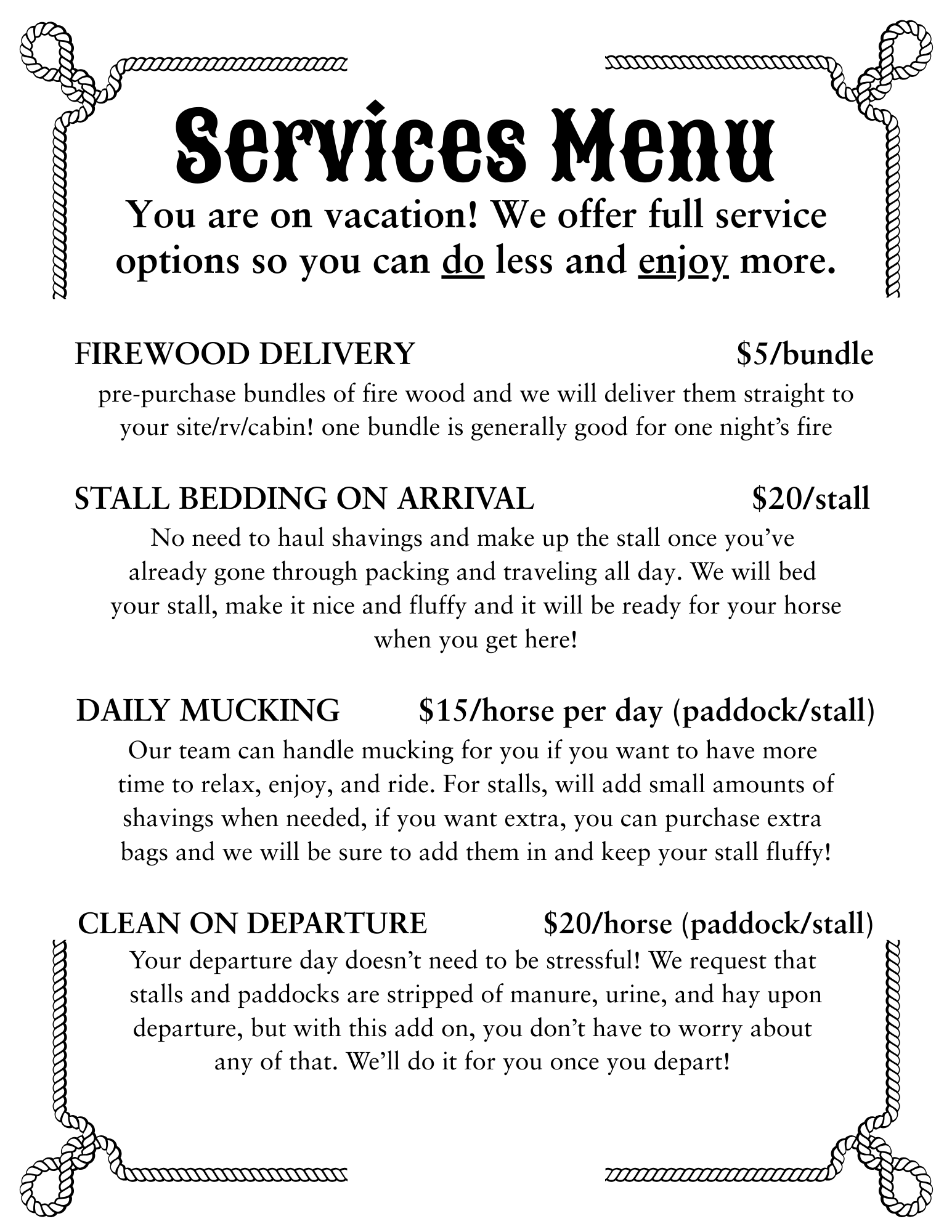 We offer many full service amenities, one of them being stall-bedding, which you can add to your booking for a $20/stall one time fee, and we will have your stall fluffy and bedded for you on arrival! On a daily basis, it is up to you to keep your stall or paddock clean (muck buckets and pitch forks will be available nearby, muck buckets are picked up by the tractor every morning and must be out by 10am). You can opt for stall cleaning on departure, so that on your last day you don’t have to worry about it, for $20/stall. Otherwise, we do expect that your stall be left clean and free of manure or hay from your horses stay.